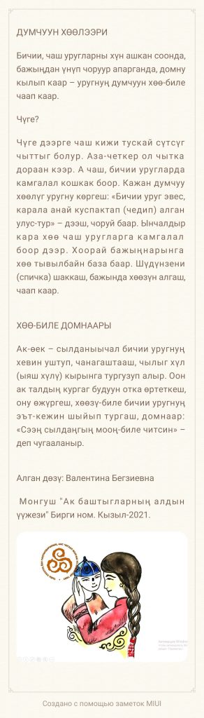 Кулун – бениң чаш төлү, назыны бир хар чедир, эр кулун база кыс кулун дээр.
