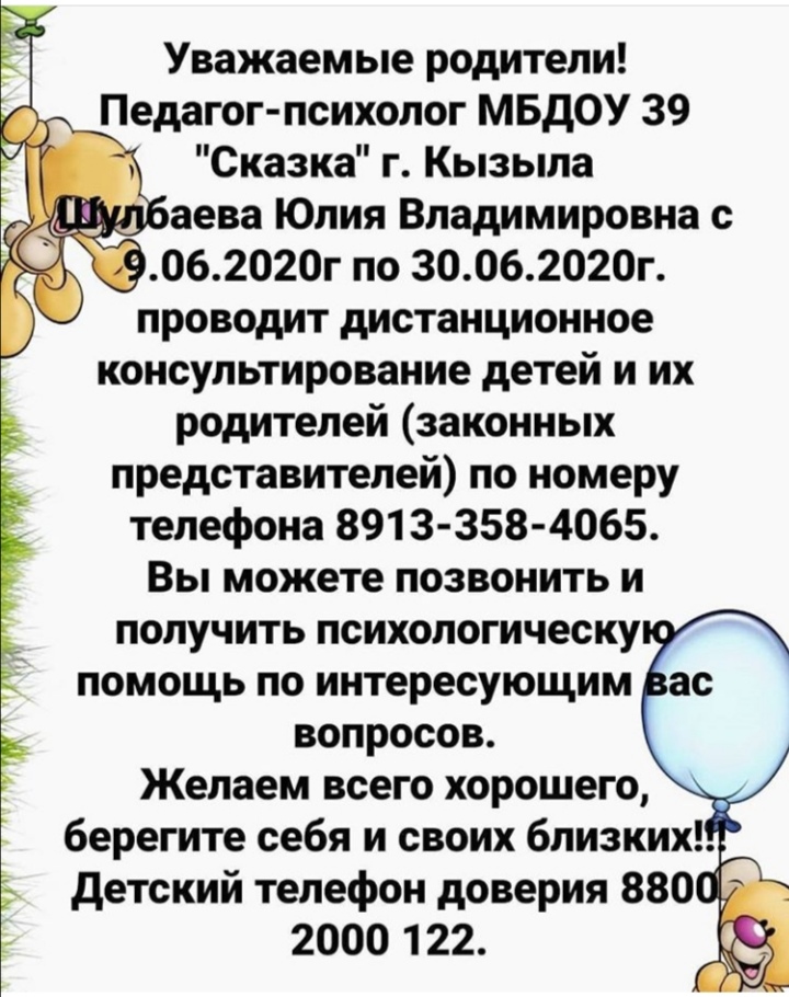 С Целью исполнения Распоряжения Главы Республики Тыва Ш.В. Кара-оола от 06.06.2000г. №188-РГ, обращения директора ГБУ РЦПМСС «Сайзырал» Монгуш А.З., с целью организации превентивных мер, направленных на снижение психологического напряжения в семьях обучающихся и воспитанников, профилактики жестоко обращения, аутоагрессивного и девиантного поведения детей и подростков, гармонизации детско-родительских отношений в период ограничительных мероприятий (карантина) на территории Республики Тыва
