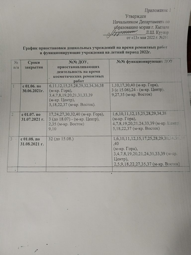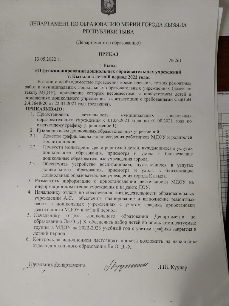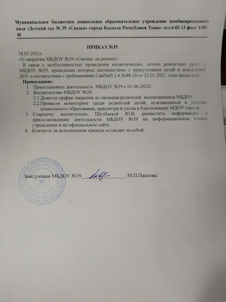 О функционировании дошкольных образовательных учреждений г. Кызыла в летний период 2022г. В связи с необходимостью проведения косметических, летних ремонтных работ в муниципальных дошкольных образовательных учрежднений. Приказ о закрытии МБДОУ √39 «Сказка» на ремонт с 1.06.по 30.06